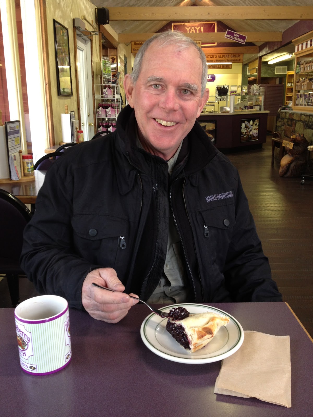 Today was a ride across Montana, Big Sky Country. I knew that on our way, in the neat little town of Hungry Horse, MT was The Huckleberry Patch!! The place has been in business for 20 years and the people that own it have been dealing with Huckleberries for over 60 years. They do know Huckleberries! This was my THIRD time stopping by and having a piece of Huckleberry pie. I stopped here in 2007, 2010 and now 2013 (hmmm, every 3 years, will be interesting if I am back again in 2016, maybe so!!!!). I had asked Bill if he liked Huckleberries and he said "oh yes". I told him I knew the place we were going to stop by for Huckleberries in that case (of course, I was going to stop whether he liked them or not!!)
